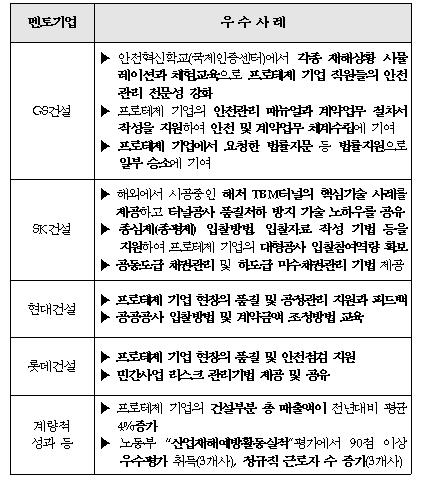 그 결과 대기업의 법률자문과 소송지원, 산업재해 예방활동 향상, 계약 및 안전관리 업무체계 구축 등 중소기업 맞춤형 성과를 달성했다.