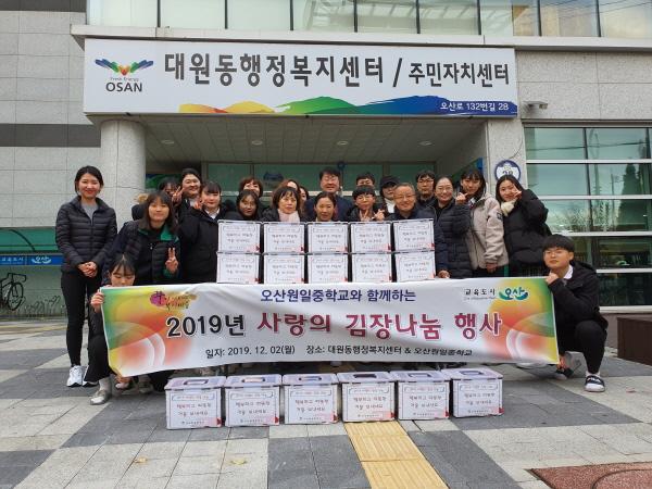 오산시 대원동행정복지센터는 지난 2일 오산원일중에서‘2019 오산원일중 교육공동체와 함께하는 사랑의 김장 나눔 행사’를 개최했다고 밝혔다.