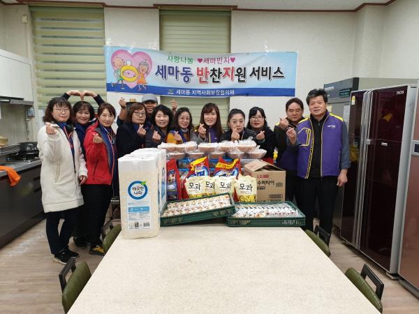 오산시 세마동지역사회보장협의체와 오산백합로타리클럽은 지난 3일 직접 조리한 육개장, 제육볶음, 가지볶음과 후원받은 콩나물무침, 잔다리두유, 생필품 등을 세마동 소외계층 23가구에 전달했다.