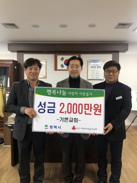 평택시 이충동에 위치한 기독교대한감리회 기쁜교회는 지난 3일 송탄출장소를 방문해 관내 소외되고 어려운 이웃을 위해 사용해 달라며 추수감사절 특별헌금 2천만원을 이웃돕기 성금으로 기탁했다.