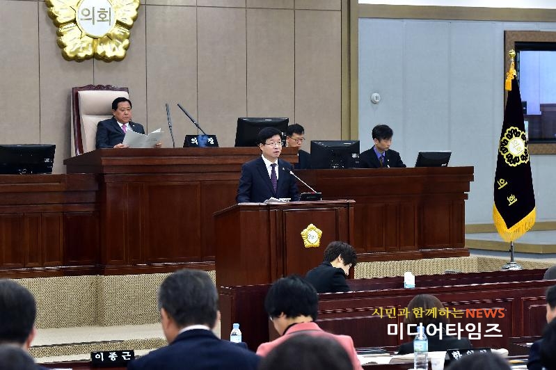 | 1일 염태영 시장이 수원시의회 제323회 제2차 정례회 제1차 본회의에서 시정연설을 하고 있다. <ⓒ미디어타임즈> |