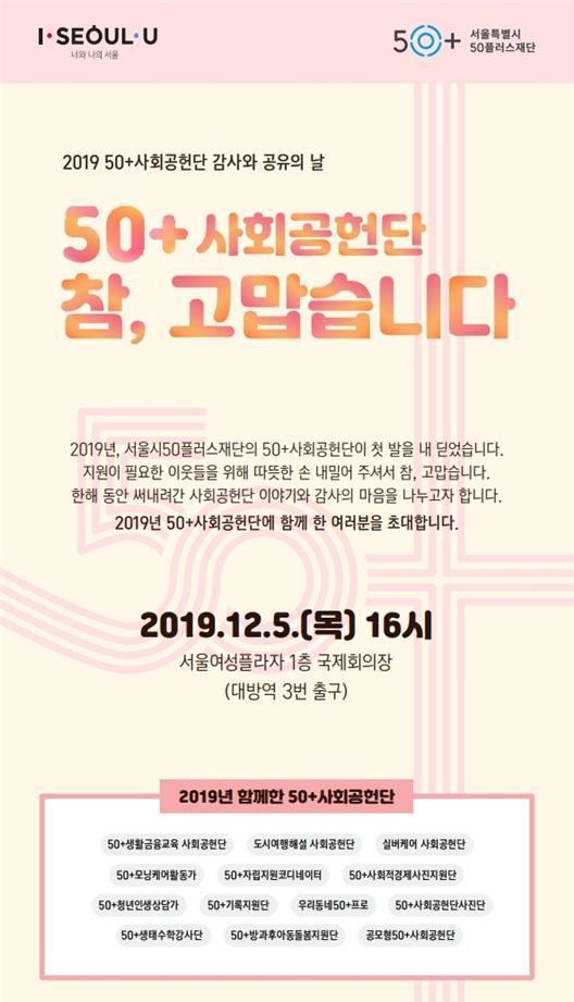 서울시50플러스재단은 올 한 해 동안 사회공헌활동에 참여한 50+세대가 한자리에 모여 감사와 성과를 나누는 행사를 5일 서울여성플라자 1층 국제회의장에서 개최한다.