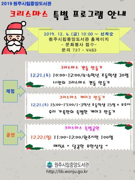 원주시립중앙도서관이 크리스마스를 앞두고 오는 21일과 22일 양일간 크리스마스 특별 프로그램을 운영한다.
