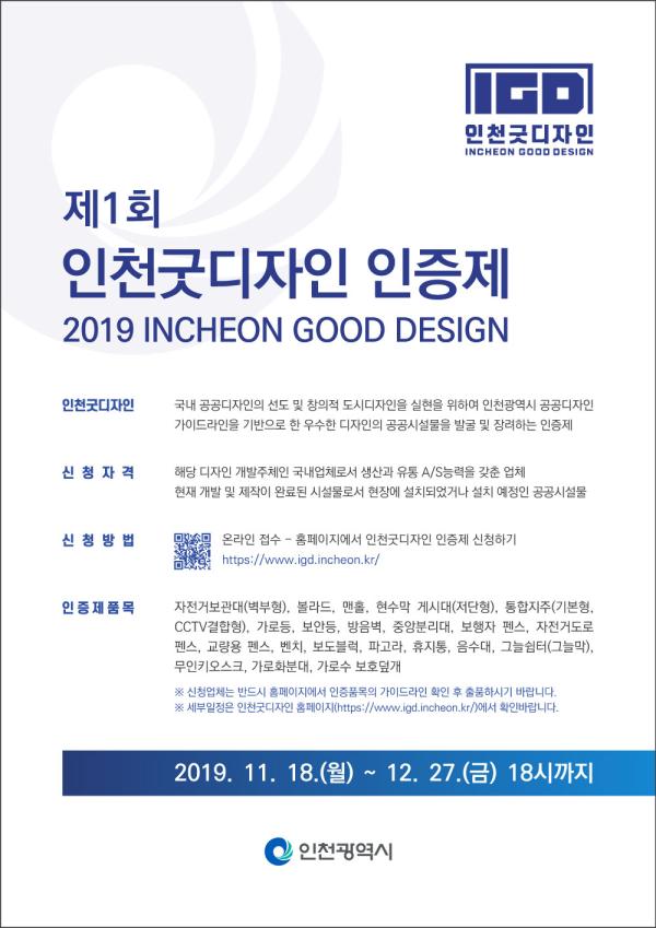 인천시가 우수한 디자인의 공공시설물을 발굴·보급해 공공디자인의 수준 향상 및 디자인산업 활성화를 위해 ‘제1회 인천굿디자인 인증제’를 실시한다.