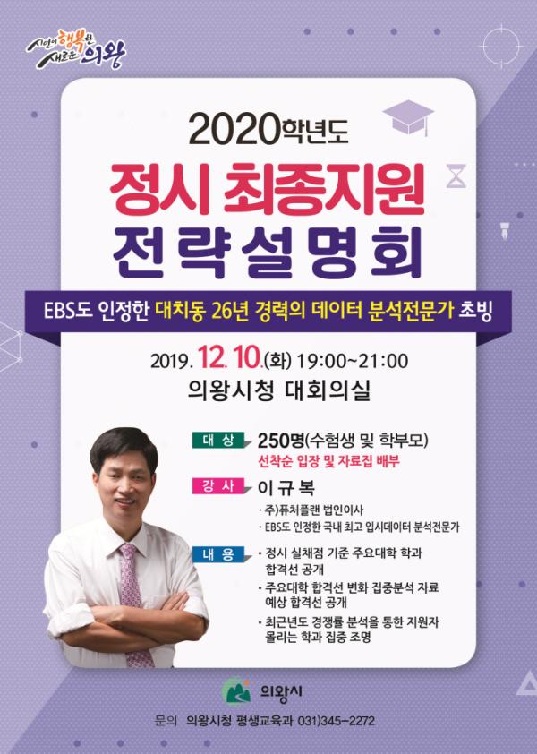 의왕시는 오는 10일 오후 7시 시청 대회의실에서 2020학년도 대입 정시 최종지원 전략설명회를 개최한다.