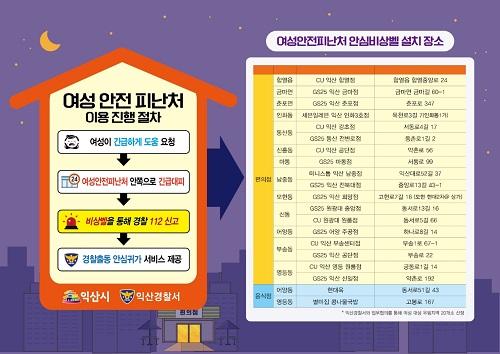 익산시는 편의점 18곳과 음식점 2곳을 여성피난처로 지정하고 안심비상벨 설치를 완료했다.