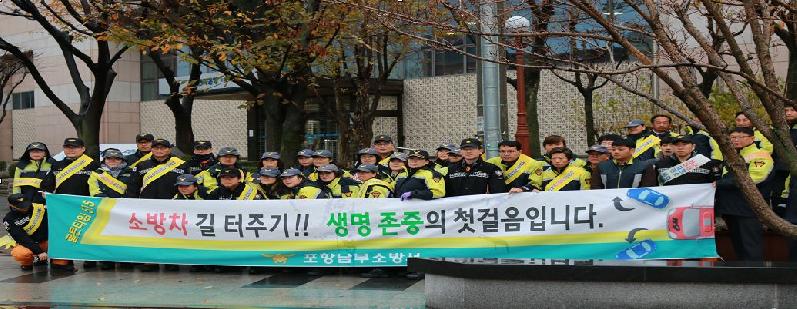 | 소방공무원과 의용소방대원의 소방차 길터주기 캠패인 모습<미디어 타임즈> |