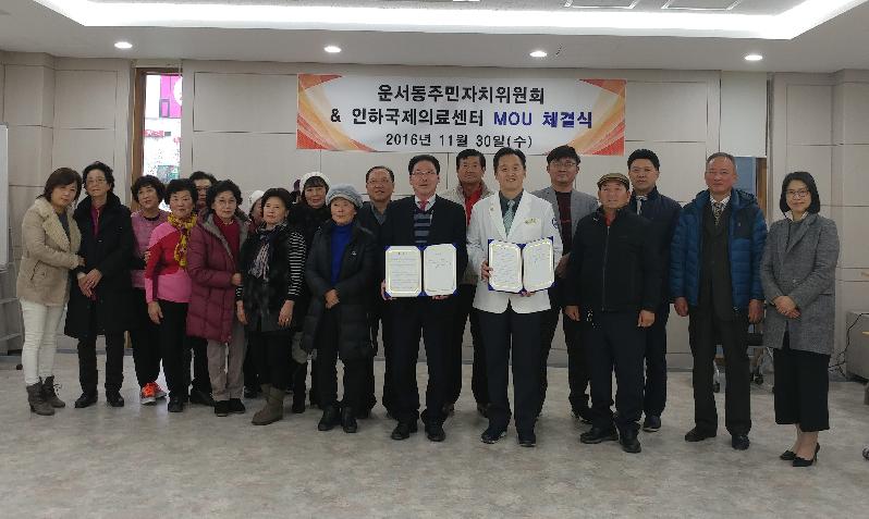 | 운서동 주민자치위원회, 인하국제의료센터와 의료협약(MOU) 체결 후 기념 촬영을 하고 있다. <ⓒ미디어타임즈> |