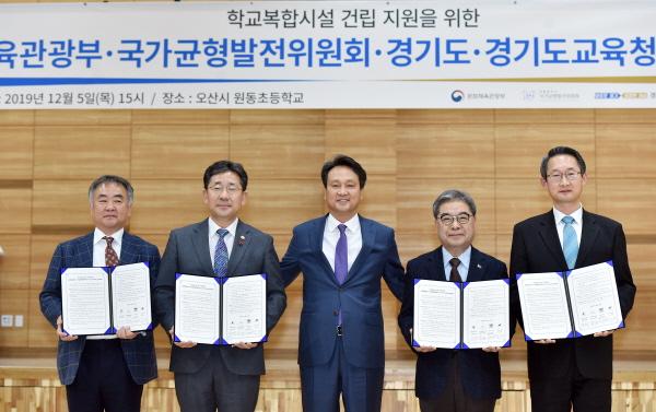 경기도교육청이 5일 오산 원동초등학교에서 문화체육관광부·국가균형발전위원회·경기도청과 ‘수영교육 활성화를 위한 학교복합시설 건립지원을 위한 업무협약’을 체결했다.