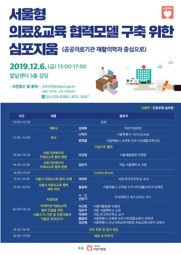 서울특별시 어린이병원은 6일 오후 1시에 어린이병원 삼성발달센터 5층 강당에서 의료 및 교육 전문가와 지역 사회인이 참여하는 ‘서울형 의료&교육 협력 모델 구축 위한 심포지엄’을 개최한다.