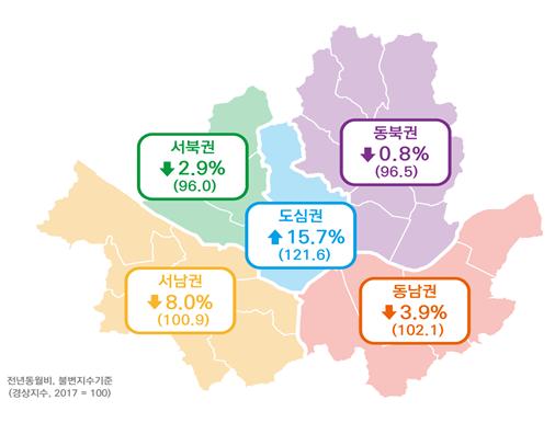 권역별로는 도심권만이 소비 호조를 보이고 나머지 권역은 소비 부진이 계속되고 있으나 동북권과 서북권은 감소폭이 축소됐다.