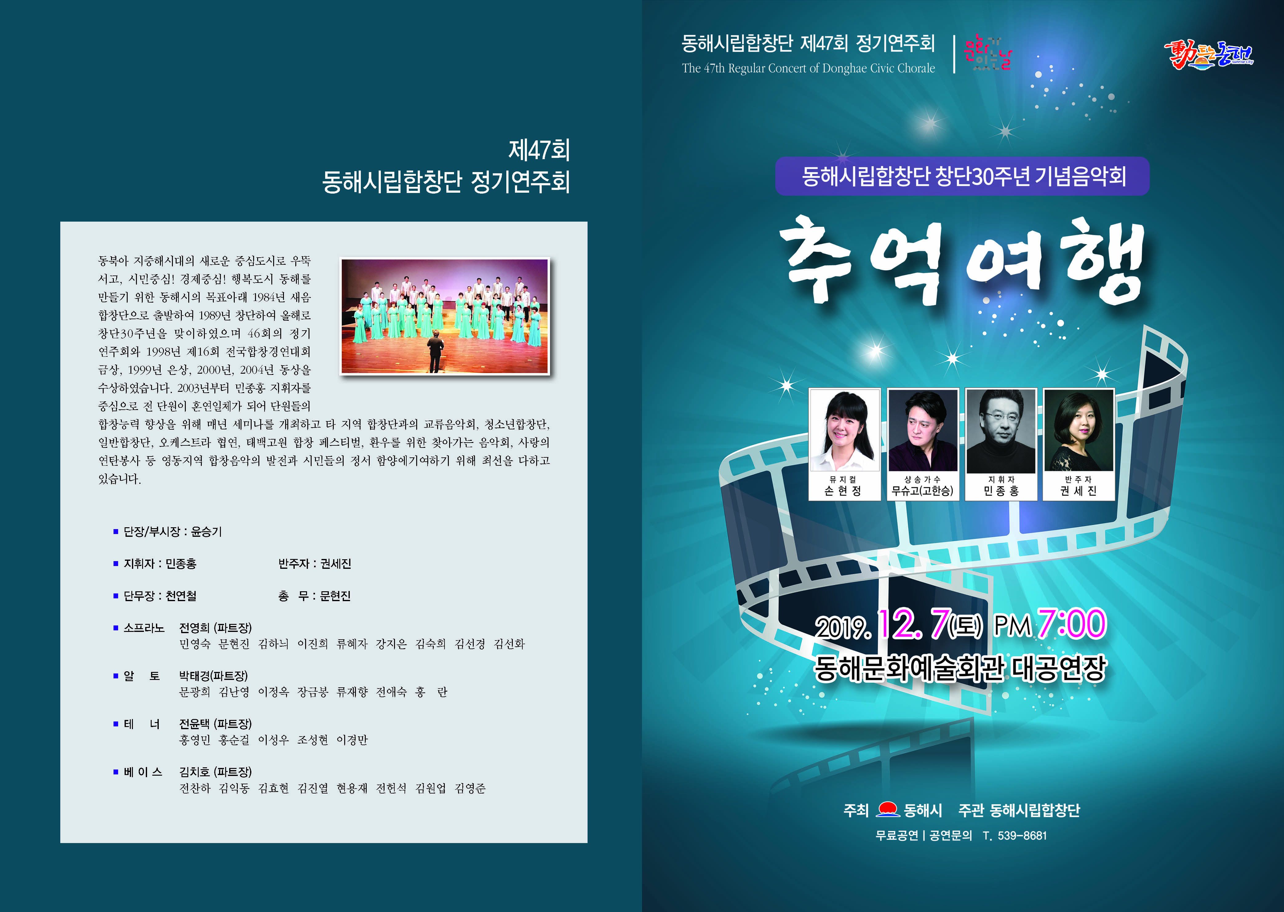 동해시립합창단 창단 30주년을 맞이해 ‘추억여행’이라는 타이틀로 진행되는 이번 정기연주회는 옛 추억의 향수와 감성을 느낄 수 있는 깊이 있는 선율과 감미로운 하모니를 선사할 예정이다.