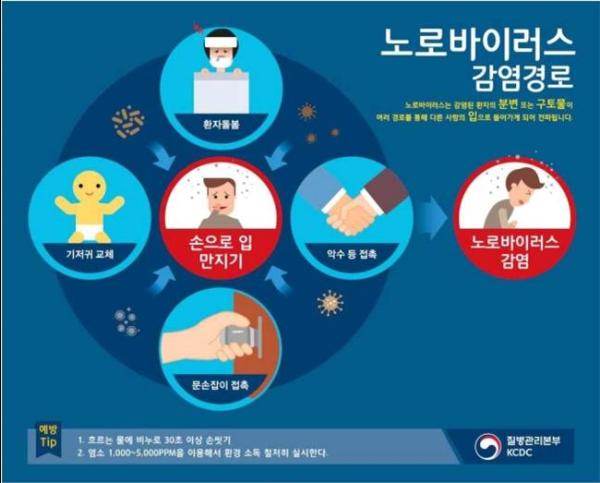 노로바이러스 감염증은 노로바이러스에 오염된 음식물과 물을 섭취했거나 환자 접촉을 통한 사람 간의 전파가 가능한 감염병으로 접촉감염은 환자의 구토물을 통해서 또는 손을 씻지 않고 만진 수도꼭지, 문고리 등을 다른 사람이 손으로 만진 후 오염된 손으로 입을 만지거나 음식물 섭취 시 감염될 수 있다.