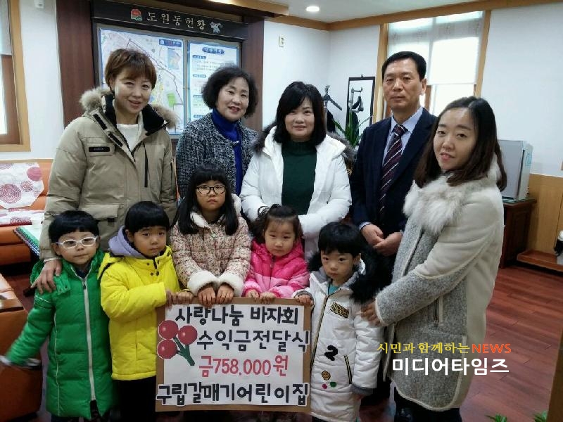 [미디어타임즈=문상수 기자] 구립 갈매기어린이집(원장 김진자)는 지난 6일 도원동 주민센터에서 75만8천원을 생활이 어려운 이웃들을 위해 써달라며‘도원동 사회복지협의체 ’에 기부했다.이날 기부금은 어린이집과 학부모로 구성된 운영위원회가 금년도에 어린이집 앞 광장에서‘사랑 나눔 바자회’를 열어 어린이들이 집에서 가져온 학용품, 장난감, 신발, 책, 의류 등 1,000여점과 학부모들이 현장에서 직접 만든 김밥, 떡복기, 잡채 등 먹거리를 선생님과 학부모, 어린이들이 직접 판매한 수입금 전액이다.기부된 금액은 도원동 지역 내 사각지대에 놓여있는 독거노인 등 취약자를 발굴하여 지원할 예정이다.