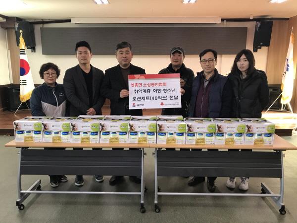 인천시 영흥소상공인협회가 동절기를 맞아 소외계층, 청소년 등 지역의 어려운 이웃을 위해 지난 4일 영흥면사무소를 찾아 바디로션 세트 40박스를 전달했다.