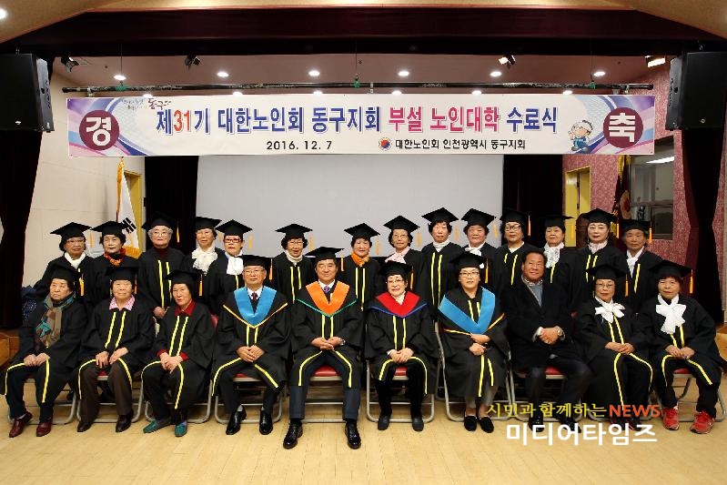| 동구 대한노인회 동구지회 부설 노인대학 수료식 개최 후 기념 촬영을 하고 있다. <ⓒ미디어타임즈> |