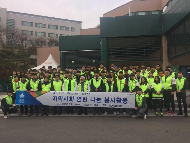 [미디어 타임즈 = 배수남 기자] 대구한의대(총장 변창훈)와 대구카톨릭대(총장 홍철)는 12월 7일 (수) 13시부터 지역사회 연탄나눔 봉사활동을 실시했다. 이번 봉사활동은 양교 총장을 비롯해 교직원과 봉사단 100여명이 참가하여 1,600장을 직접 전달하고 총8,000장의 연탄을 하양읍 지역에 거주하는 독거노인들에게 전달하였다. 변창훈총장은 "궂은 날씨에도 불구하고 나눔 봉사활동에 함께 해 주신 봉사단에게 감사의 인사와 함께, 대학구성원에게 사회봉사 수행기회를 제공함에 따라 지역사회 나눔 문화 확산에 이바지 할 필요성이 크며 이런 필요성을 기반으로 협력봉사 활동이 일회성에 그치지 않고 지속적으로 이어나가자"고 하였다. 나눔행사를 마치고 양교 봉사단 모두 대구카톨릭대학에서 준비한 뒷풀이 행사후 내년에 다시 만날것을 약속하고 마쳤다.