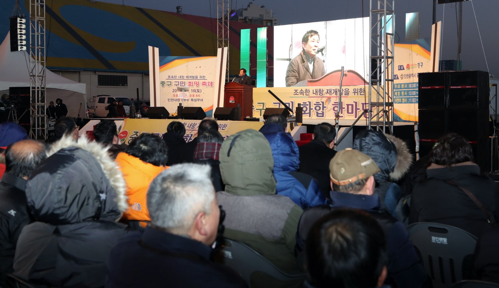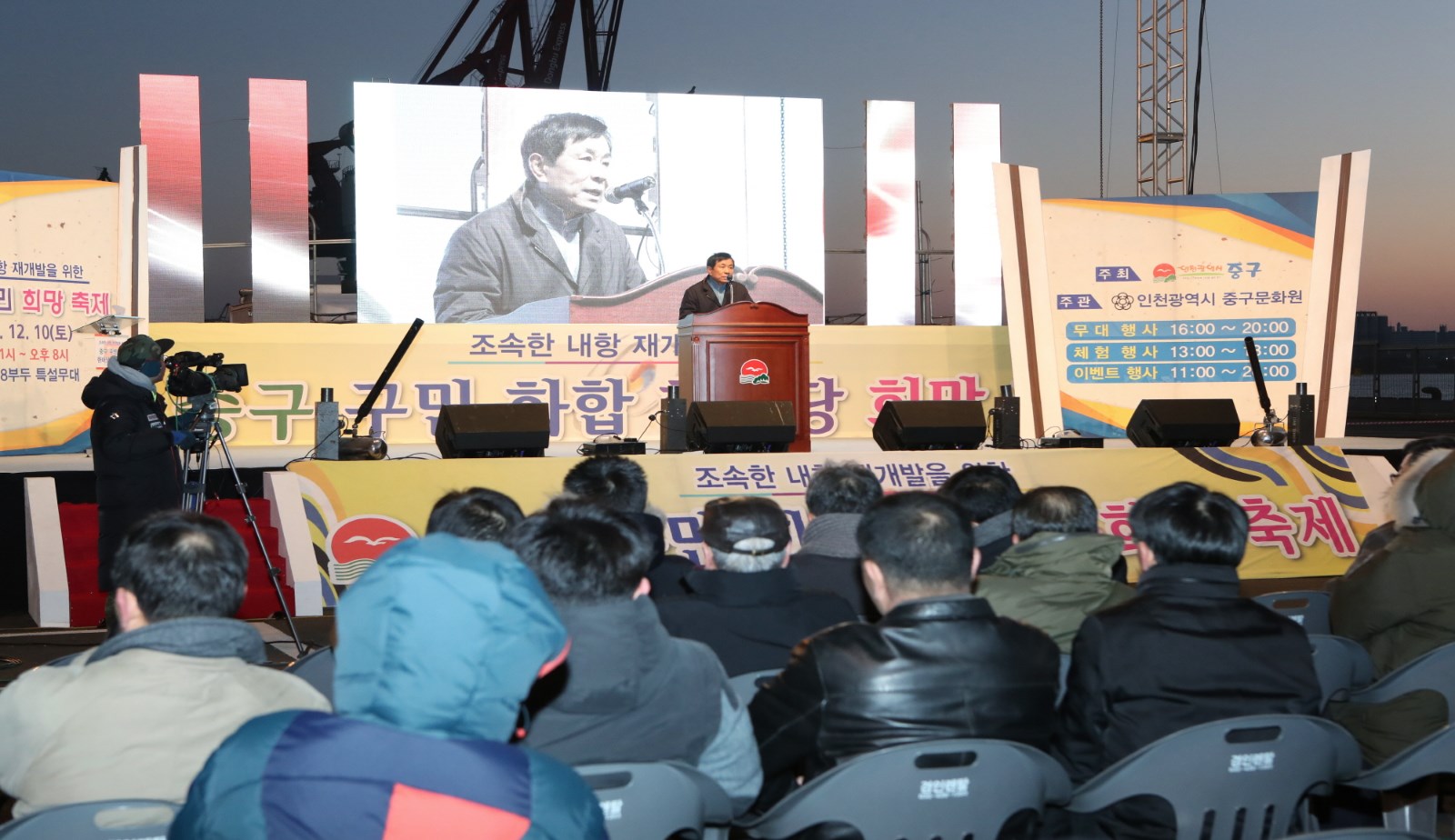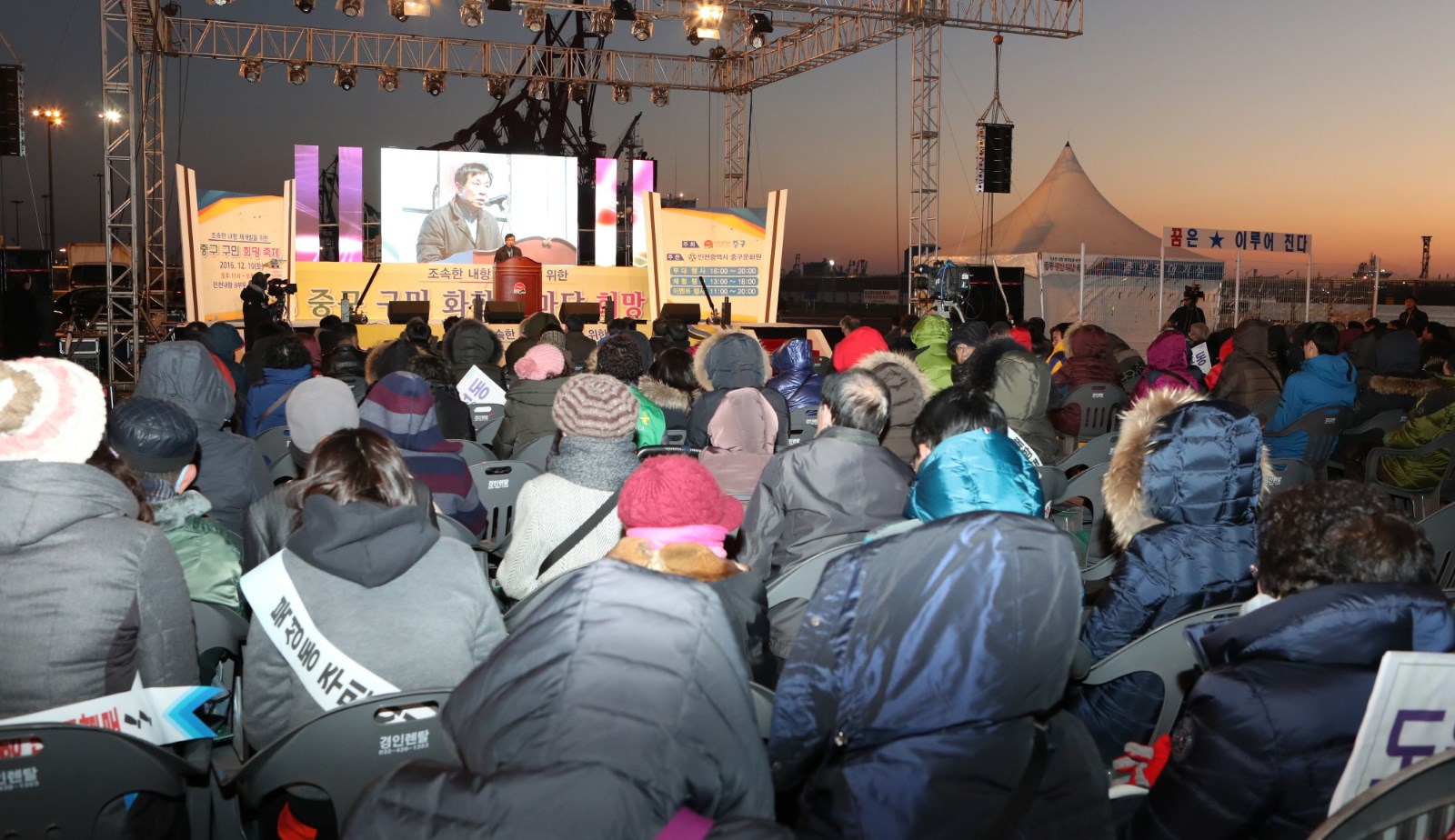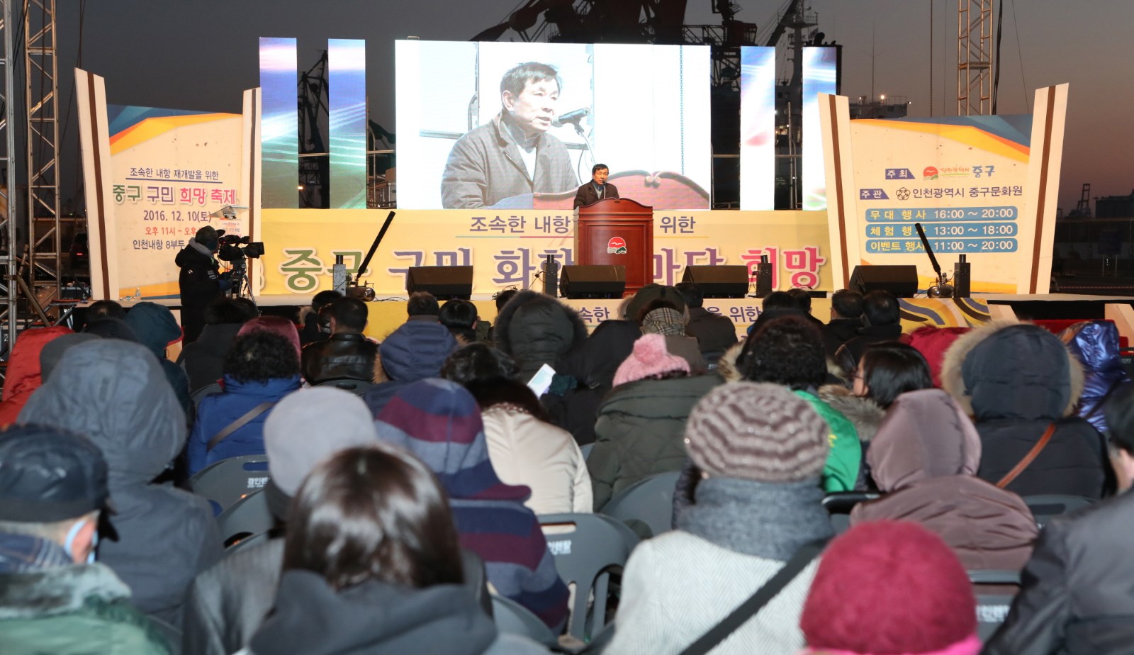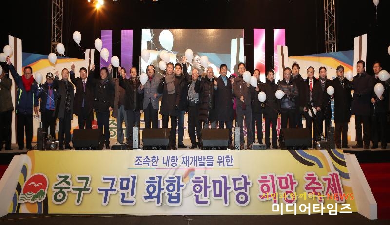 [미디어타임즈=문상수 기자] 인천 중구(청장 김홍섭)는 지난 10일, 40여 년간 내항과 화물차로 인한 공해로 고통받아온 지역주민들의 희망인 조속한 내항 재개발을 기원하는「2016 중구 구민 희망 축제」를 인천 내항 8부두 (월미도 입구)에서 주민 2,000여명이 참석하여 성황리에 개최했다.작년 ‘2015 송년 대축제’에 이어 두 번째로 내항 8부두 광장에서 개최한 이 행사는 인천광역시 중구가 주최하여 구민들의 숙원사업인 내항 재개발에 대한 희망을 기원하는 다채로운 행사와 축하공연을 가지며 구민들의 화합을 도모했다.기념식에서 김홍섭 구청장은“주민의 열망과 노력으로 시작한 내항 재개발에 대해 감사와 격려를 드린다”며, “내항의 물동량 감소와 인천의 북항, 남항, 신항 등 외항 개장에 대해 강조하며 내항 재개발은 이제 선택이 아닌 시대적 요구이자 원도심 재생의 유일한 희망이다”고 전하며 목소리 높였다.한편 현재 정부의 지원으로 원활하게 진행되고 있는 부산 북항 재개발 사업에 대해 비교하며 13억 중국과의 하늘길, 바다길로 열려있는 내항의 입지와 2천5백만 수도권의 해양친수공간의 부재 등의 조건을 살펴보면, 내항의 가치는 부산 북항보다 훨씬 더 높으며 이런 내항 재개발에 대한 정부의 적극적인 지원과 관심, 그리고 관계기관 및 항만업계 등의 적극적인 협조를 요구하며 조속한 내항 항만재개발 사업추진이 대한민국과 인천 발전의 원동력이 될 것임을 외쳤다.특히, 김홍섭 구청장은 지난 11월 22일 국회회관 정책토론회에서 해양수산부 장관 및 관계기관들이 주민들 앞에서 약속한 내항 전체 재개발에 대한 조속한 추진을 앞으로 주민들이 지속적으로 요구해 나가야 한다고 주문하였다. 이날 행사에서는 참석한 주민들은 체험행사와 축하공연을 함께 즐기며 희망을 염원하는 다양한 부대행사도 눈길을 끌었다. 특히 많은 주민들이 참여하여 2016년 한해를 마무리하며 새해에 대한 가족들의 소원과 내항 재개발에 대한 희망을 담은 메시지를 매다는‘희망리본 매달기’행사와 500명이 넘는 참여자들이 동시에 띄워 올린 LED풍선은 내항의 밤하늘을 아름답게 수놓아 장관을 이루었다.이외에도 내항 재개발과 관련한 단막극을 통해 주민들의 공감대를 형성하고, 하이라이트 행사로 이미 8부두가 개방하였지만 높은 수림대로 가로막혀 있어 아직 개방 사실을 알지 못하는 시민들에게 야간에도 8부두 개방을 홍보하기 위해 인천항만공사에서 조성한 희망의 경관 등에 대한 점등식을 개최하여 참석자들이 모두 환호하였다.참석한 주민은“한해를 보내며 주민들과 같이 지역사회의 가장 큰 문제를 축제를 통해 한자리 모여 다시 한 번 돌이켜 보는 뜻깊은 행사였다”고 말하면서 “이제는 정말로 내항 재개발 사업이 진행되어 우리 주민뿐만 아니라 타지의 관광객, 나아가 해외관광객까지 찾게 되는 관광명소가 되길 바란다”고 전했다.