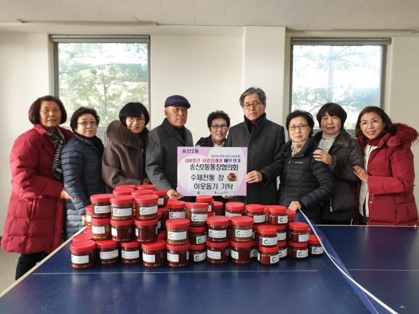 원유현 송산2동 통장협의회장은 “이번 기탁품은 송산2동 통장님이 깨끗한 재료로 직접 담가 정성이 가득 담겨있어 받는 분들이 더욱 만족할 것이라 기대한다”며 “어려운 이웃들에게 조금이나마 보탬이 되었으면 좋겠다”고 밝혔다.