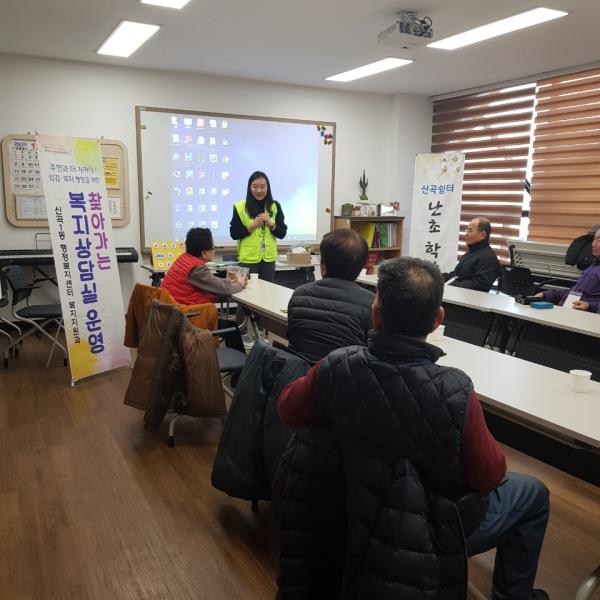 이날 신곡치매안심센터의 치매예방교육 강의에 앞서 찾아가는 복지상담실에 대해 안내하고 교육 후 1:1 국민기초생활보장과 기초연금 등 사회복지서비스에 대한 설명과 상담이 진행됐다.