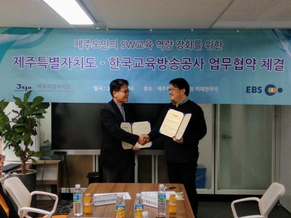 제주특별자치도와 한국교육방송공사가 6일 오전 제주도청 미래전략국장실에서 제주도민의 소프트웨어 교육 발전을 위한 상호 지원 업무협약을 체결했다.