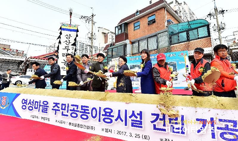 [미디어타임즈=문상수 기자] 부평구(구청장 홍미영)는 삼산1동 영성마을의 생활환경을 개선하고 마을공동체가 활동할 수 있는 공간을 확충하기 위해 지난 25일 오후 ‘영성마을회관’에서 ‘영성마을 주민공동이용시설 건립’ 기공식을 가졌다.이날 행사에는 홍미영 부평구청장, 임지훈 부평구의회 의장을 비롯한 구·시의원, 지역 주민 등 100여 명이 참석, 영성마을 주민공동 시설의 조속한 완공을 기원했다.부평구는 영성마을 주민협의체와 2년여의 협의 과정을 통해 지난 2월 ‘영성마을 주민공동이용시설’을 주민들이 원하고 필요하다고 느끼는 마을회관, 경로당, 마을공동작업장과 주민 취미공간이 가능한 시설로 조성하기로 합의한 바 있다.부평구는 2013년부터 총예산 55억 원(건립비 23억 원)을 확보, 부지매입, 보안등 설치, CCTV 설치, 교통 환경 개선 등의 사업을 진행해 왔으며 올 12월 주민공동이용시설을 준공할 예정이다.홍미영 부평구청장은 “주민 숙원이던 주민공동이용시설 건립의 첫 삽을 뜨게 돼 매우 기쁘게 생각한다”며 “준공 이후 편안한 마음으로 자주 방문하고 싶은 열린 공간과 주민중심의 장소가 될 수 있도록 주민들의 많은 관심과 참여를 부탁드린다”고 밝혔다.부평구는 삼산1동 영성마을 주민공동이용시설이 지역주민 등 사용자의 마을 커뮤니티 공간으로 활용될 수 있도록 프로그램을 운영, 주민거점 공간 및 지역공동체 핵심요소로 발전시킬 계획이다.