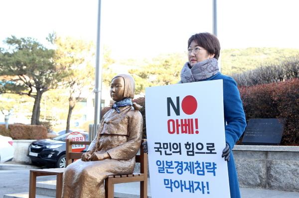 경기도의회 경제노동위원회 고은정 의원은 올겨울 최강 추위가 몰아친 6일 경기도청 앞에서 경기도의회 더불어민주당이 주관한 ‘일본의 경제보복 철회 촉구 릴레이 1인 시위’에 적극 동참했다.