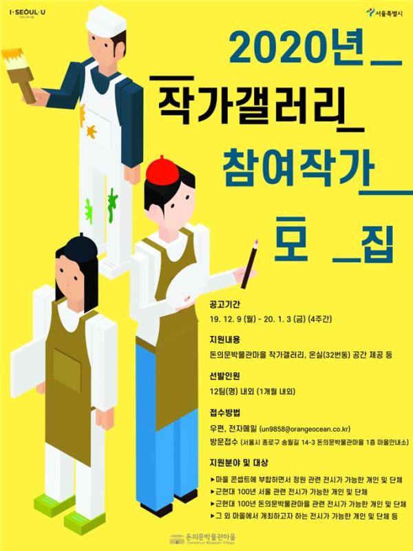 서울시 돈의문박물관마을은 ‘근현대 100년, 기억의 보관소’ 콘셉트에 따라 2020년 작가갤러리에서 다양한 예술분야의 전시를 보여줄 역량 있는 우리 동네 작가를 공개 모집한다.