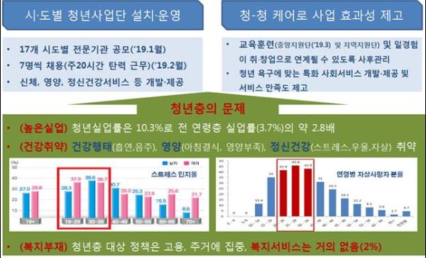 한편 한국보건복지인력개발원에서 청년사회서비스 이용자 510명과 제공인력 111명을 대상으로 서비스 만족도를 조사한 결과, 이용자의 평균 만족도는 84.8점이었으며 10명 중 9명이 청년 대상 신체·정신 건강 서비스가 필요하다고 응답했고 계속 이용 의향도 86%나 됐다.