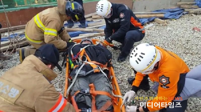 | 인천서부소방소 공사장 추락사고로 인한 부상자를 신속히 고조 하고 있다. <ⓒ미디어타임즈> |