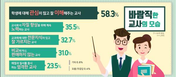 경기도민이 생각하는 이상적이고 바람직한 교사상은 ‘학생에 대해 관심이 많고 잘 이해해 주는 교사’, ‘교사로서 자질 향상을 위해 계속 노력하는 교사’, ‘교과목에 대한 전문지식이 있고 잘 가르치는 교사’ 순이다.