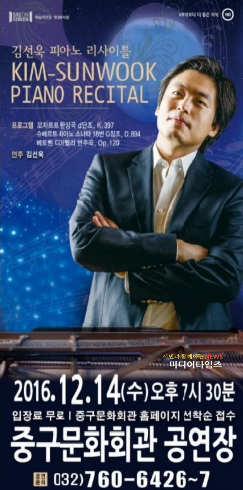 [미디어타임즈=문상수 기자] 인천 중구문화회관의 올해 마지막“SAC on Screen”은 지난 7월 예술의 전당 콘서트홀에서 공연된「김선욱 피아노 리사이틀」을 선보인다. 오는 14일 오후 7시 30분 중구문화회관 공연장에서 상영되는 이번 공연은 2006년 리즈 콩쿠르대회에서 대회 40년 역사상 최연소 우승자인 피아니스트 김선욱이‘모차르트 환상곡 d단조, K.397' , '슈베르트 피아노소나타 18번 G장조, D.894', '베토벤 디아벨리 변주곡, Op.120' 등을 들려준다.중구문화회관 관계자는 이번 스크린 콘서트가 다양한 각도에서 10대 이상의 4K카메라로 촬영된 초고화질 영상을 생동감 있게 편집해 객석에서는 절대 볼 수 없는 아티스트의 생생한 표정과 몸짓을 관객들에게 감동적으로 전달하게 될 것 이라고 전했다.