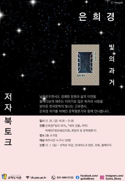파주시 교하도서관은 오는 20일 연말을 맞아 소설 ‘새의 선물’과 ‘빛의 과거’의 은희경 작가와 ‘82년생 김지영’ 편집자이며 2018년 젊은평론가상을 수상한 박혜진 평론가를 초청해 북토크를 진행한다.