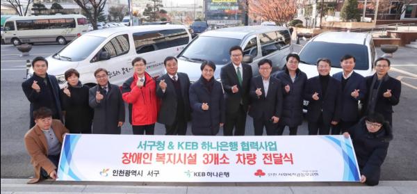 인천 서구는 KEB하나은행으로부터 사회복지공동모금회를 통해 승합차량 3대를 기증받아 지난 6일 장애인이용시설 3개소에 승합차를 전달했다.