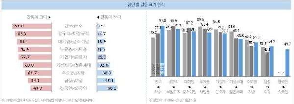 한편 우리 사회 주요 집단별로 갈등 중에서는 ‘진보와 보수’ 간 갈등이 ‘크다’가 91.8%로 매우 높게 나타났다. 이는 2016년도 결과보다 14.5%포인트 대폭 상승한 것이다. 이어 갈등이 ‘크다’는 응답은 정규직-비정규직 85.3%, 대기업-중소기업 81.1%, 부유층-서민층 78.9%, 기업가-근로자 77.7% 등의 순서였으며 남성-여성 간은 54.9%, 한국인-외국인 간은 49.7%로 나타났다.