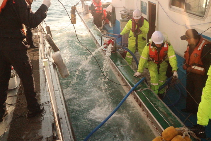 | 침수선박에서 배수펌프로 배수작업을 하고 있다<미디어 타임즈> |