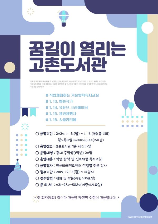 김포시 고촌도서관은 2020년 1월 13일부터 1월 16일까지 2020년 겨울방학 독서교실 ‘꿈길이 열리는 고촌도서관’을 운영한다.