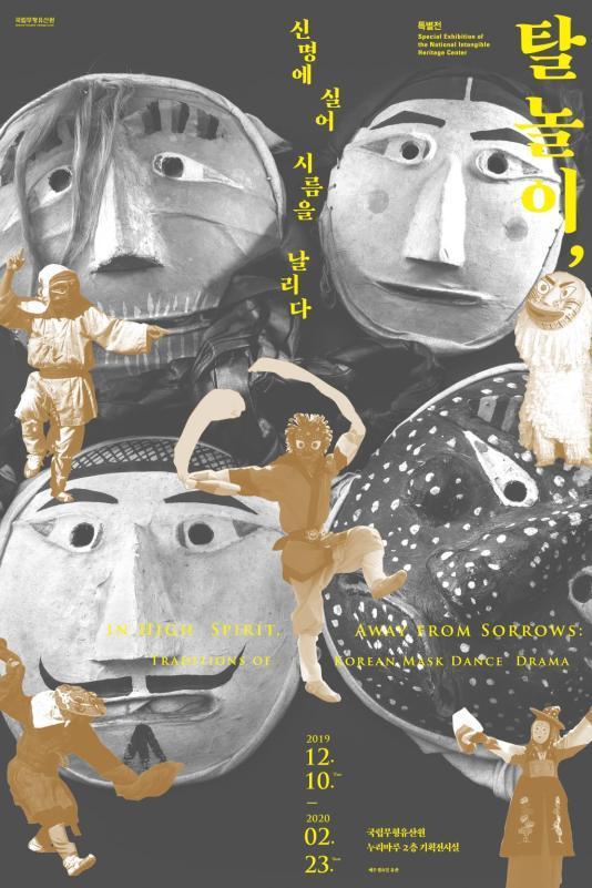 문화재청 국립무형유산원은 오는 10일부터 2020년 2월 23일까지 국립무형유산원 누리마루 2층 기획전시실에서 2019년 특별전 ‘탈놀이, 신명에 실어 시름을 날리다’를 개최한다.