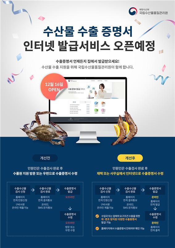 국립수산물품질관리원은 오는 16일부터 수산물 수출 지원을 위한 ‘수산물 수출증명서 인터넷발급’ 서비스를 개시한다.