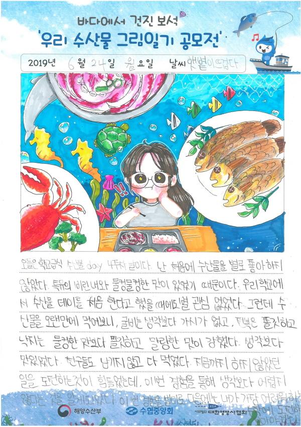 이번 공모전에서는 학교에서 배운 우리 수산물의 영양·우수성 등을 그림과 일기로 표현했으며 주제 표현력 완성도 참신성 등을 기준으로 평가했다.
