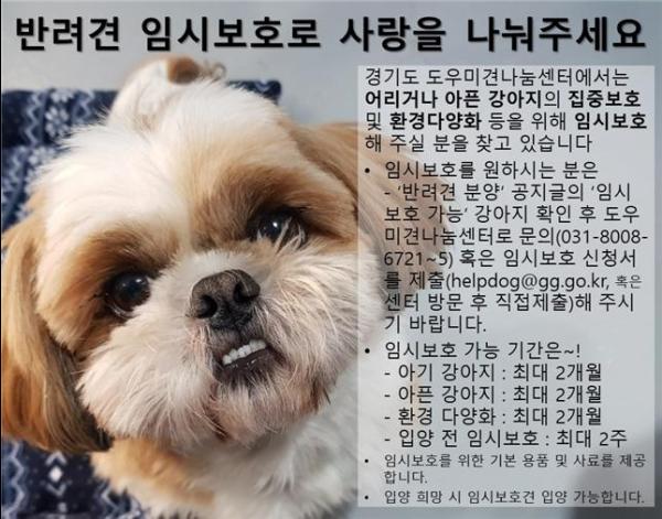 임시보호제 참여 등 자세한 사항은 경기도 도우미견나눔센터 인터넷 카페를 참고하거나 전화로 문의하면 된다.