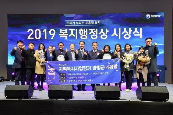 양평군은 지난 9일 세종컨벤션센터에서 보건복지부 주관 2019년 복지행정상 시상식에서 2019년 지역복지사업평가 ‘지역사회보장계획 시행결과’와‘희망복지지원단 운영’두개 분야에서 대상, ‘민관협력 및 자원연계’분야 최우수, ‘찾아가는 보건복지서비스 제공’분야 우수상을 수상하는 쾌거를 이루는 등, 전국에서 복지분야 우수지자체로서의 입지를 확고히 했다.