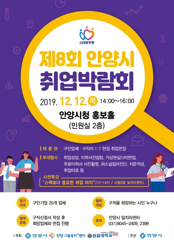 안양시의 금년도 8번째이자 마지막 취업박람회가 오는 12일 오후 2시부터 4시까지 시청 홍보홀에서 열린다.