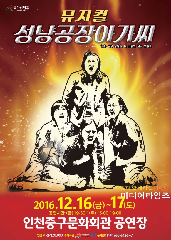 [미디어타임즈=문상수 기자] 1960년 ~ 70년대 인천의 성냥공장을 배경으로 한 창작 뮤지컬 가 오는 12월 16일(금)~17일(토) 이틀동안 인천 중구문화회관 공연장에서 개최된다.는 제30회 인천 항구연극제 최우수작품상과 제30회 전국연극제 인천 대표 출품작으로 선정되었던 연극‘화’를 원작으로 현대적인 감각을 살려 뮤지컬로 재탄생 시킨 작품이다.우리나라 산업화를 이끈 여공들의 애환이 서린 작업장인 성냥공장을 소재로 당시 여공들과 그 주변의 이야기를 주인공 인화와 인숙 자매를 통해 풀어내고 있는 이번 작품은 40년전의 암울한 시대적 상황을 통찰하며 성냥공장의 부도, 여공들의 삶을향한 절규, 공천에서 탈락한 사장의 분노 등을 담아낸다. 한편 공개된 포스터에는 여공들이의 애환과 울부짖는 모습이 붉은 배경과 대조되게 그려져 있어 이야기에 대한 궁금증을 불러 모은다. 중구문화회관 관계자는“이번 공연이 장년층에게는 옛 시절의 추억과 향수를, 젊은이들에게는 현대적 감각의 춤과 음악으로 이전 세대와의 소통과 공감을 이끌어 내며 다채로운 재미와 감동을 선사할 것”이라고 전했다.성냥공장 아가씨 관람료는 정가 20,000원이며 중구 구민에게는 50%, 문화회관 홈페이지 회원에게는 30%의 파격적인 할인을 제공해 각각 10,000원, 14,000원에 예매가 가능하다. 티켓 예매는 인터파크에서 진행중이며 공연과 관련하여 자세한 사항은 중구문화회관 홈페이지(http://artcenter.icjg.go.kr), 또는 전화 (☎인터파크1544-1555)로 문의하면 된다.