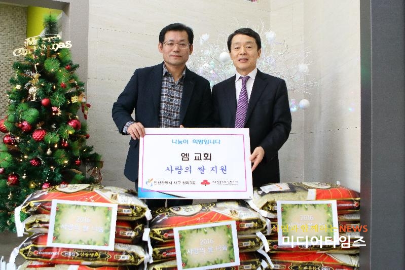 [미디어타임즈=김동일 기자] 엠교회(담임목사 김응수)는 지난 12월 10일(토) 청라3동을 따스하게 만들기 위한 취지로 12월의 행복한 음악여행을 열면서 관내 어려운 이웃에게 지원해 달라며 쌀 20kg 20포를 청라3동주민센터(동장 최형순)에 전달했다.청라3동 지역사회보장협의체 공동위원장으로 활동 중인 김응수 담임목사는 “작은 정성이지만 어려운 이웃에게 힘이 되었으면 좋겠다”며 “지속적인 관심과 나눔을 실천하며 따뜻한 마을을 만드는데 기여하겠다”고 말했다. 최형순 청라3동장은 “우리지역 주민들에게 항상 도움을 주시는데 감사드린다”며 “앞으로도 지역주민들을 위한 나눔 활동에 꾸준한 사랑과 관심을 바란다“고 전했다.이날 전달된 양곡(20kg) 20포는 관내 거주하고 있는 독거노인 및 한부모가정 등 생활이 어려운 저소득가구에 골고루 전달될 예정이다.