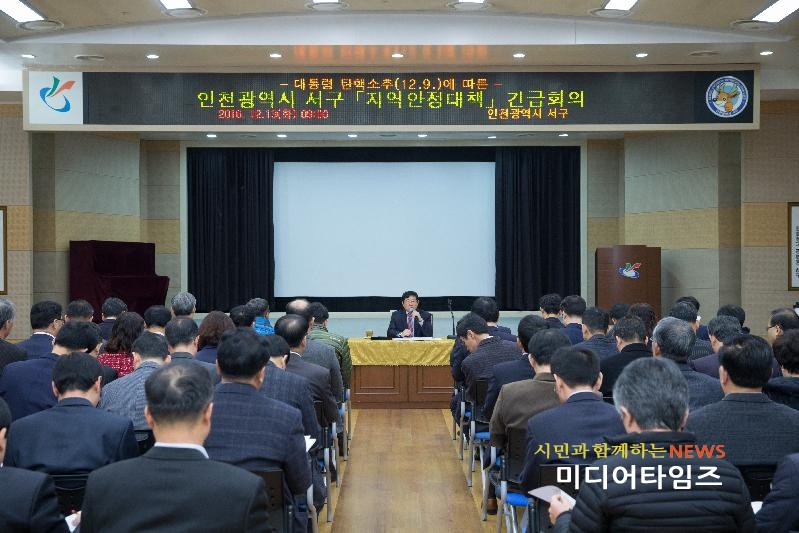 [미디어타임즈=김동일 기자] 인천광역시 서구(구청장 강범석)는 지난 13일(화) 구청 대회의실에서 5급 간부공무원 전원(54명)이 참석한 가운데 지역안정을 위한 긴급 대책회의를 가졌다.이날 회의는 지난 9일 국회가 대통령 탄핵소추안을 통과시키면서 발생할 수 있는 지역사회와 주민들의 불안감을 최소화하기 위한 대책회의였다.회의를 주재한 김승희 부구청장은 “국정이 불안한 현 상황에서 공직자가 할 수 있는 최선은 자신의 소임을 충실히 수행해 나가는 것”이라며, “사회분위기에 편승해 동요되지 말고 동절기 주민안전대책 추진 및 연말연시 소외계층에 대한 나눔 확산을 통해 민생안정을 챙김은 물론 개인 이메일과 PC, 청내 정보통신시설에 대한 보안에 각별히 신경 써 달라”고 말했다.또한, 최근 전국적 확산을 보이며 지역 안전을 위협하고 있는 고병원성 AI에 대해 빈틈없는 방역활동으로 AI 전파 사전차단에 철저를 기해 줄 것을 함께 당부했다.