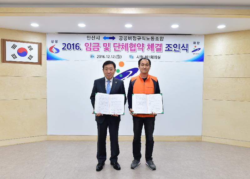[미디어타임즈= 신정식 기자] 안산시(시장 제종길)와 공공비정규직노동조합(위원장 이성일)은 지난 12일 시청 제1회의실에서 2016 임금 및 단체협약을 체결하고 조인식을 가졌다.