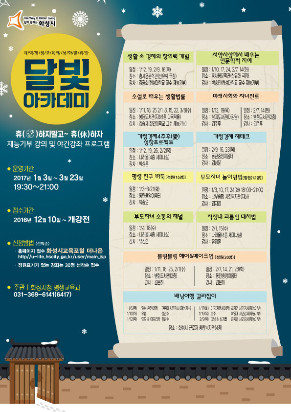 달빛아카데미와 관련한 자세한 사항은 화성시 평생교육과(031-369-6417)로 문의하면 된다.