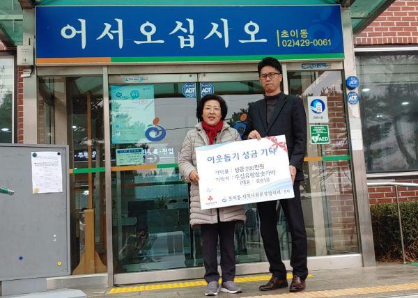 초이동 주심유황참숯가마는 지난 10일 성금 200만원을 어려운 이웃돕기 및 복지사각지대 해소를 위한 재원으로 사용해 달라며 초이동행정복지센터에 기탁했다.