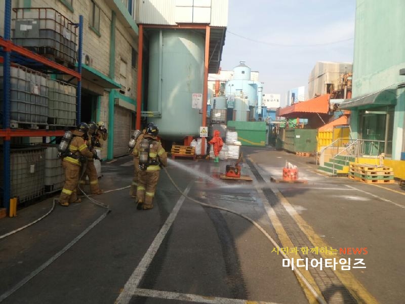 [미디어타임즈=김동일 기자] 인천서부소방서(서장 김준태)는 13일(화) 석남동에 위치한 (주)경인양행에서 유해화학물질 누출사고 대응훈련을 실시했다.이번 훈련은 본서와 구조대, 석남119안전센터 등 소방차량 6대와 소방공무원, 자위소방대원 등 50명이 참석한 가운데 ▲유해화학물질 특성별 소화방법 및 초기 대응 요령 ▲화학구조장비 사용법 및 개인임무별 조작 숙달 훈련 ▲유해화학물질 누출 시 신속한 차단조치 능력 배양 등을 실시했으며, 특히 유해화학물질이 누출하여 발생하는 2차 사고위험요인을 사전에 제거하는 훈련과 업체별 취급품목 특성에 맞는 대응훈련에 중점을 뒀다.서부소방서 관계자는 "화학물질 사고 등 다수사상자가 발생할 수 있는 대형재난사고에 대비해 지속적인 훈련과 능력배양으로 국민의 안전에 앞장설 것이다"고 말했다.